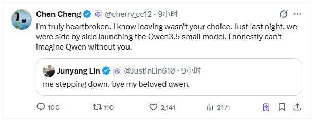 对此,通义千问核心贡献者陈程(Chen Cheng)在转发林俊旸离职动态时,透露了一些信息。陈程表示,自己很心碎,他相信“离开不是林俊旸自己的选择”。前一晚他们还一同发布了Qwen3.5小尺寸模型系列,“无法想象Qwen没有你之后的样子”。