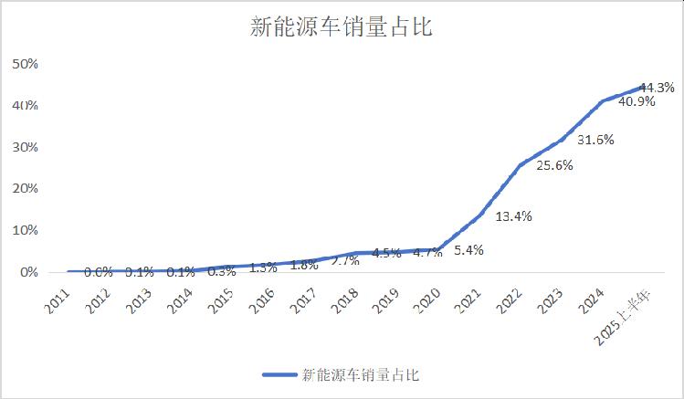 从行业渗透率看,新能源车对燃油车的替代进展顺利,市场份额自2021年起快速增加,2025年上半年达到44.3%。虽然电池以及新能源车自身的进步是主要原因,但国补政策和汽车牌照政策也起到了加速器的作用。