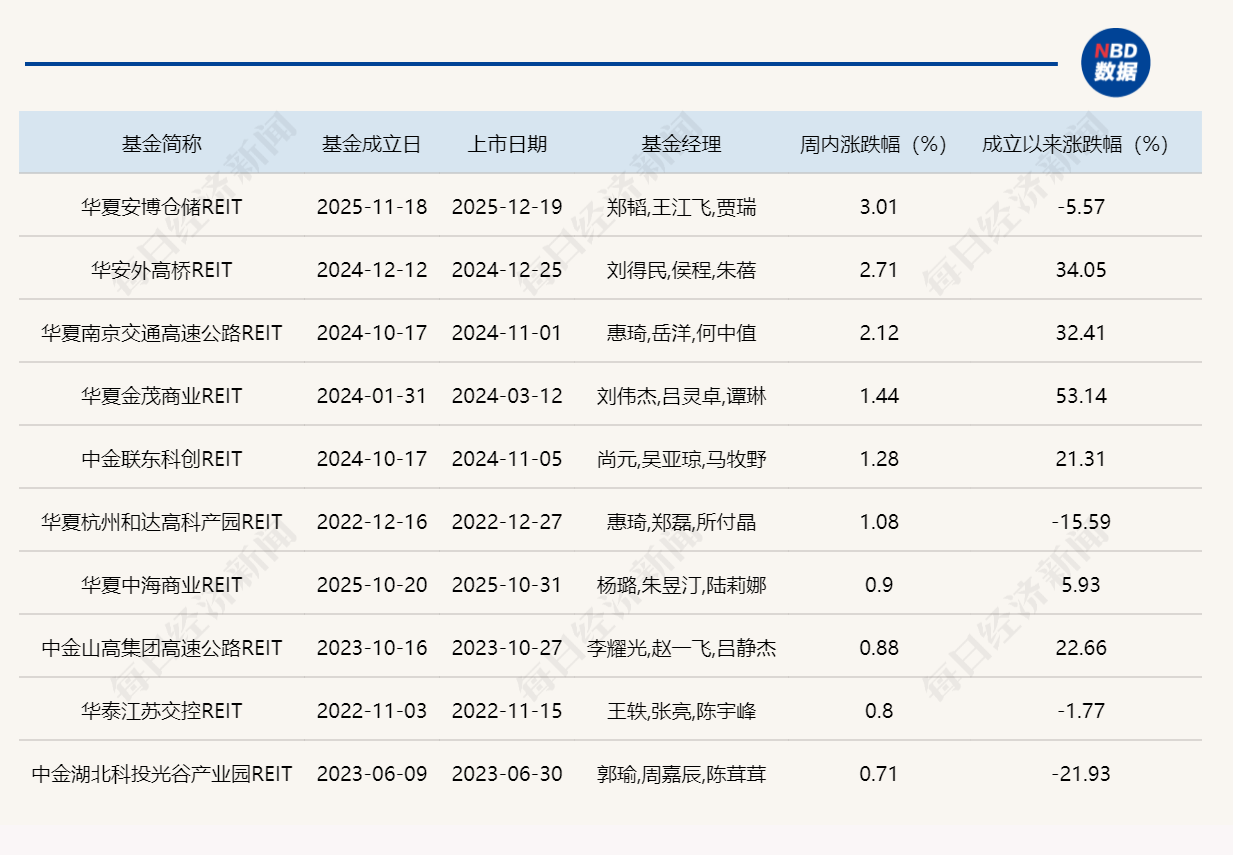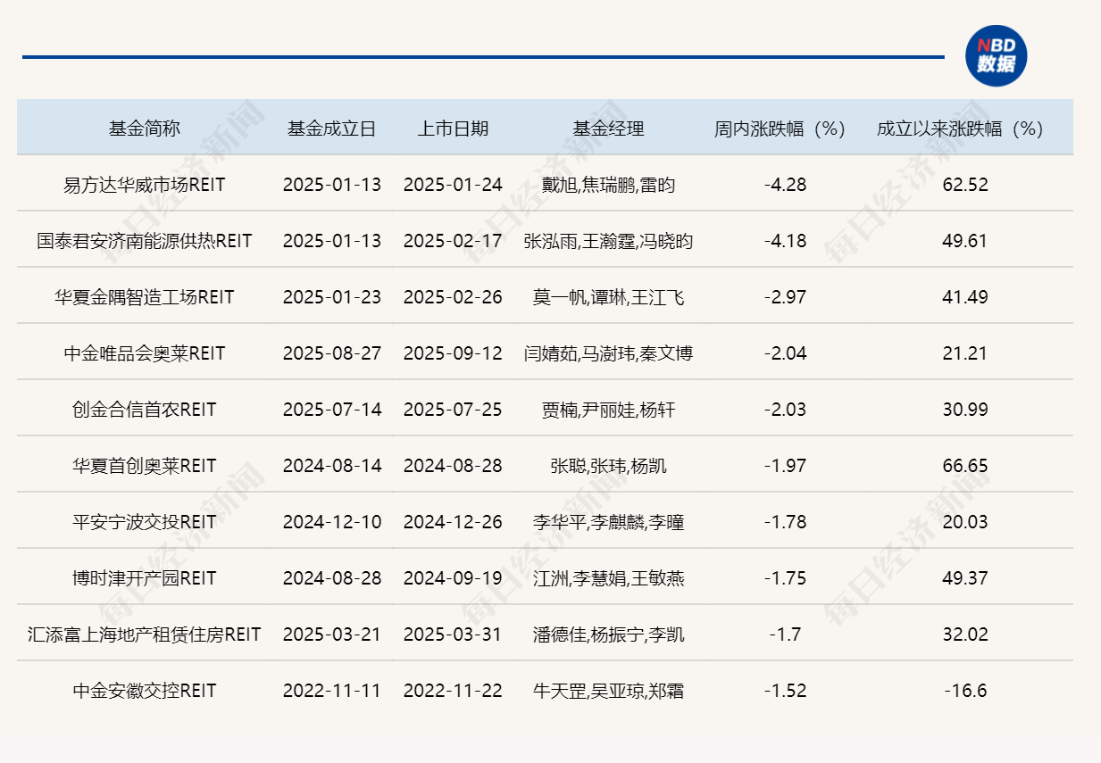 环比下跌的则增加至55只,跌幅最大的三只产品是易方达华威市场REIT、国泰君安济南能源供热REIT和华夏金隅智造工场REIT,周内分别下跌了4.28%、4.18%和2.97%。