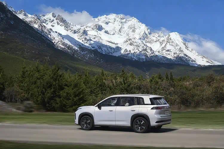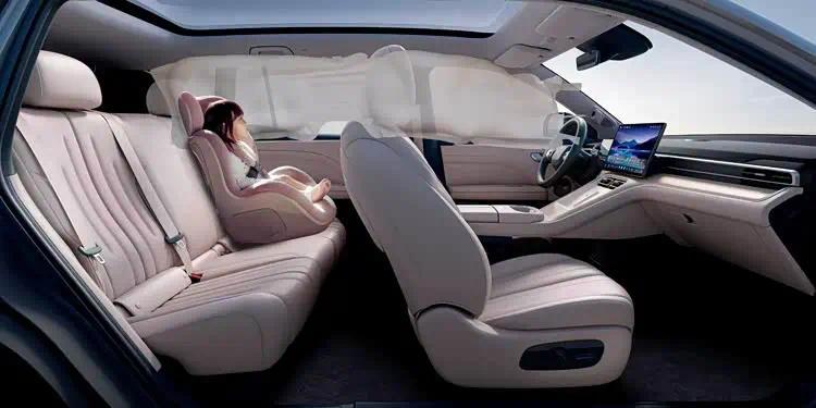 侧面来看,它的车体轮廓颇为稳重,运用更长更舒展的线条勾勒车身,让整个车身姿态在沉稳中彰显动感。同时,趋于平直的车顶线条让其车内有着更好的头部空间表现。车辆尾部则采用贯穿式尾灯设计,双层灯带设计,中央是自发光的车标,尾灯内也隐藏了辅助驾驶小蓝灯,整个尾部富有肌肉感。它的后排车门可以接近90度开启,上下车更方便,尾部配备电动尾门,低门槛设计。